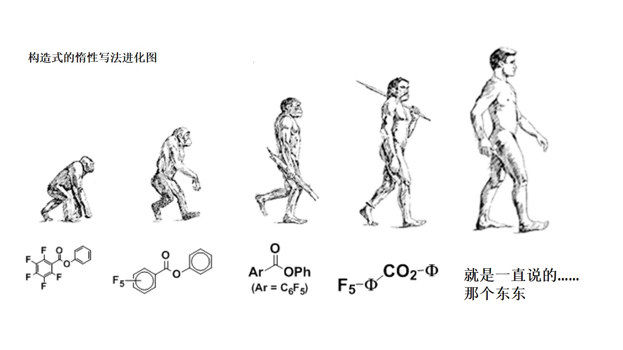 相反地 只要能迅速简单地表达出来,写成啥样都OK,这样的文化在每个lab都是根深蒂固,也是众所周知的事实。无论哪个lab大概都常使用一些简略构造式。不是讨论重心的部分就适当地写成Ar(芳香基)。用希腊字母Φ,字母Ph来表示苯环的写法也被称为最终进化形式。比起特意画个六角形那是快多了!