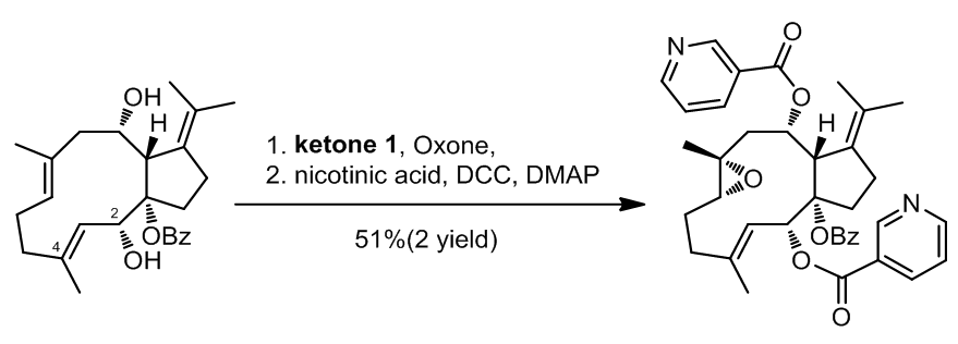 在ent-(-)-Nigellamine A2的不对称合成过程中利用了一步高度选择性的环氧化反应,当用手性酮催化不对称环氧化条件处理该反应物时,实际上在三个反应性双重物之间进行竞争。可能C2-醇可能使C3-C4烯烃失活,并且酮催化剂对该分子中的四取代烯烃不具有反应性,因此,这种单环氧化产物是反应的唯一产物2。