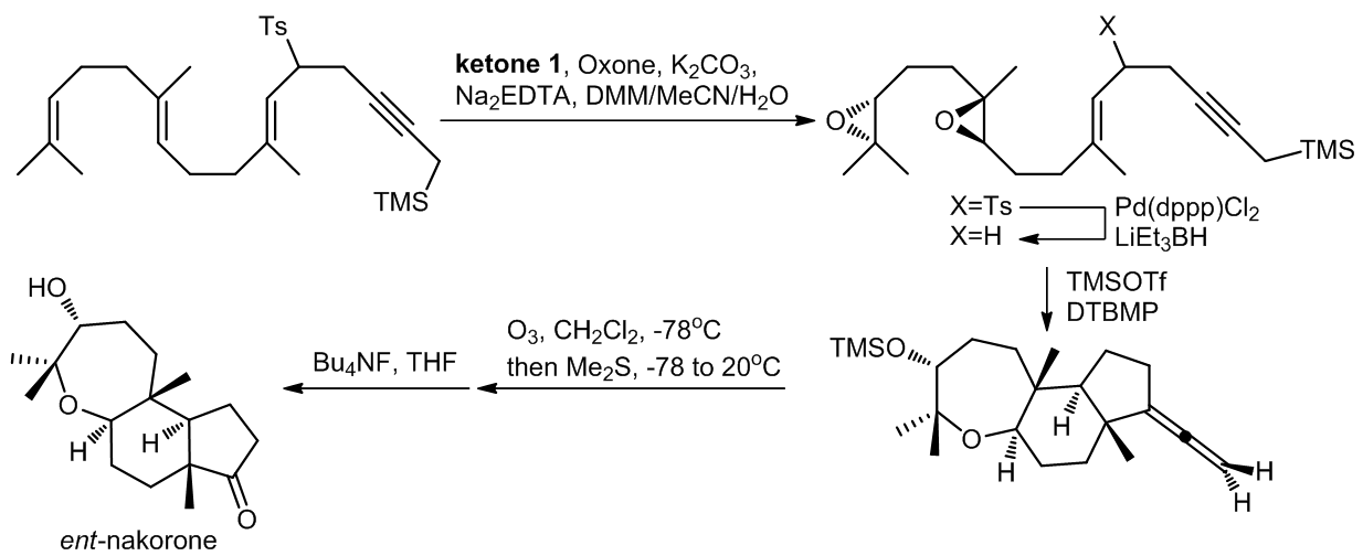 为了完成三环化合物nakorone的全合成,合成路线中利用了史一安不对称环氧化来产生多环氧化物分子,之后再进行串联反应构筑三环的分子骨架3。在钯催化的还原脱磺化后,得到的环戊二烯经历了TMSOTf引发的环化过程,随后臭氧分解了丙二烯并脱硅烷化,成功合成了三环目标分子。