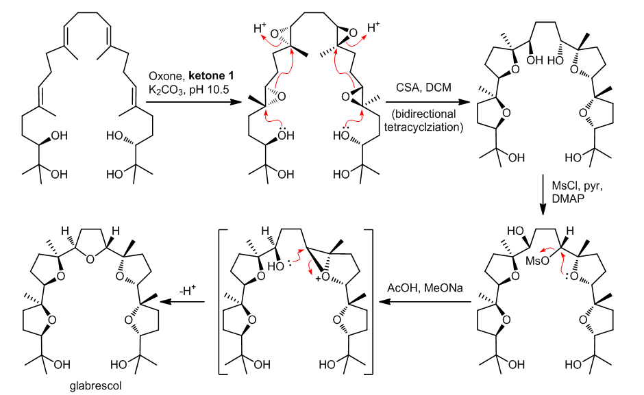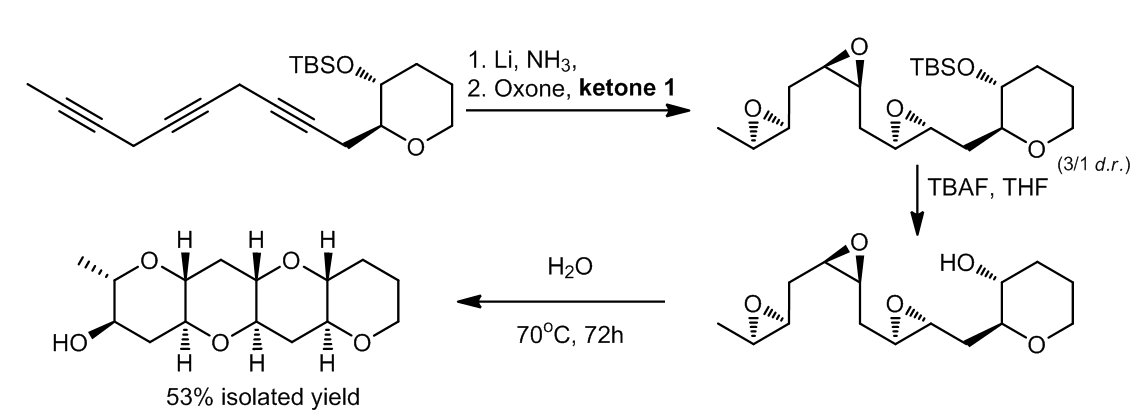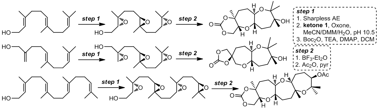 四环氧化物的前体是通过使用史一安不对称环氧化反应得到的,用CSA处理之后,在分子的两侧分别发生串联环化反应得到所需的四环产物,并且产率也很高4,5。