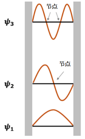 下图展示了我们已经讨论过的几种解。下图表示相应的波函数仅在一定能量下存在。顺便说一句,通常将数字1作为最低能量值及其对应的波函数的下标,以此类推,数字2就作为比最低能量高一点的能量值及其对应的波函数的下标。这些下标称为量子数。