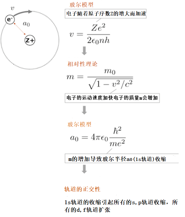 在原子序数偏大的原子中,1s 轨道上的电子的运动速度堪比光速,根据相对论效应,电子的质量会变大,进而导致1s轨道收缩。