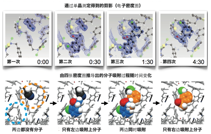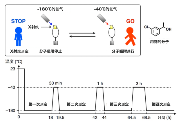 具体的来说,MMF上被吸附的分子((R)-Chlorophenylethanol)一开始并没有被吸附、将它冷却到-180℃使吸附过程完全被冻结,测这时的X射线结构。之后升温到某一温度(-40℃)使分子扩散过程重开一段时间、再度冻结测X射线・・・这样的操作循环重复四次,得到各阶段的X射线成像。