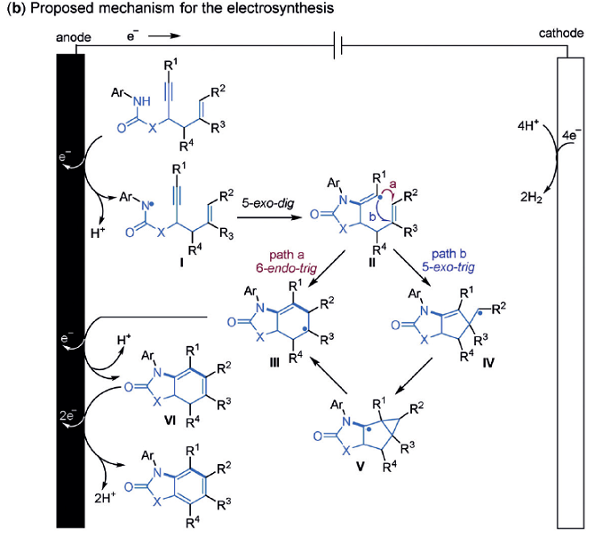 由此,作者推测了反应机理:起始物料的芳香胺基团在阳极首先氧化脱氢后生成酰胺自由基Ⅰ,接着发生5-exo-dig环合反应生乙烯基自由基Ⅱ。自由基Ⅱ可以发生两种不同的反应,path a 继续发生6-endo-trig环合反应生成环状碳自由基Ⅲ,或者path b 5-exo-trig环合后生成自由基Ⅳ,再通过一个三环自由基中间体Ⅴ再转化为Ⅲ。自由基Ⅲ继续发生单电子转移SET氧化,然后脱氢,得到中间体Ⅵ,最终失去两个电子和质子后得到苯并杂环产物。电子从阳极转移至阴极,同时和质子结合生成H2,如图6b所示。