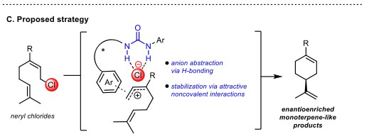 Jacobsen教授设想通过使用小分子催化剂模拟酶在反应中对碳正离子中间体反应性的调节实现尾-头环化反应。具有两个氢键的手性脲催化剂已被证实可对通过离去离子的攫取产生的碳正离子有良好的手性控制[1],且具有类似酶的非共价稳定碳正离子的能力。在此,Jacobsen教授实现了手性脲催化neryl chloride衍生物对映选择性尾-头环化反应(Figure 1C)。