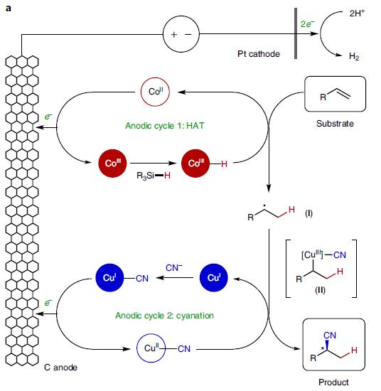 电化学合成的研究在近几年异军突起。电化学过程中产生自由基,催化剂控制自由基加成到烯烃上,可用于烯烃的双官能团化反应。最近Cornell University的Song Lin教授等采用了Co/Cu双电催化,立体选择性进行烯烃的氢氰化反应,论文发表在顶级期刊Nature Chemistry上。