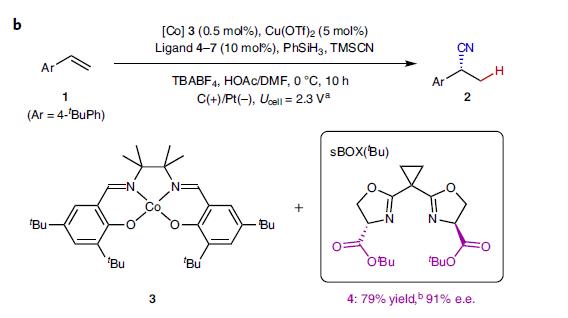作者首先评价一系列钴和铜催化剂,因铜离子可能在阴极还原失去催化能力。筛选反应条件后,作者发现以Co(salen)络合物3 (0.5 mol%)和Cu(OTf)2 (5 mol%) 为催化剂,使用恶唑啉(BOX)型配体,PhSiH3和TMSCN作为氢自由基和氰基自由基的来源, 能以较好的收率和中等选择性得到产物。
