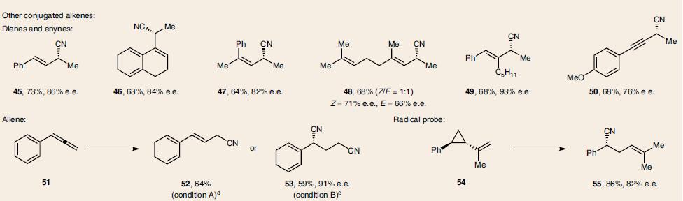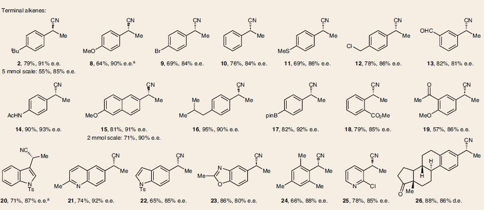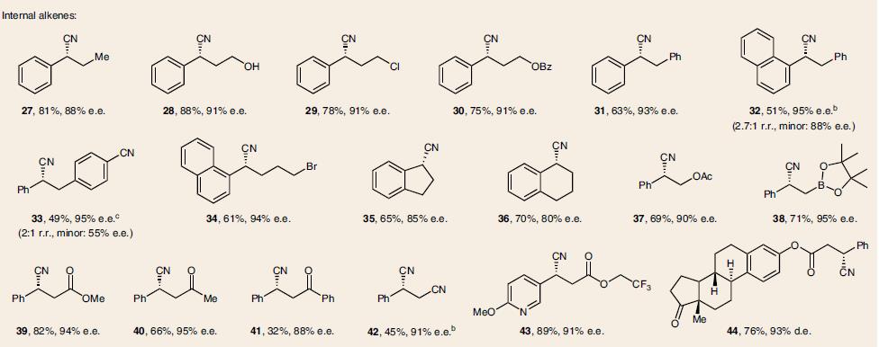 在最优化反应条件下,一系列芳基乙烯类底物都可以进行氢氰化反应,并且具有优秀的立体选择性,兼容多种官能团。如易氧化的基团含电子的烯烃(8)、(15, 20)、硫醚(11),易于偶联的苄氯(12)、芳基卤化物(9, 25)和芳基硼酸酯(17)。以及杂环烯烃(20–23,25)和含氮杂环(43)。因烯烃的E和Z不影响立体选择性,可以用混合物,如富电子的(37),缺电子的(39–44)。此外还有基于肉桂基的(酯39, 43, 44), 酮(40, 41)和腈(42),选择性的在端基双键反应的二烯烃(45–49),以及炔烃(50)、联烯(51)、环丙烷衍生物(54),如表1所示。