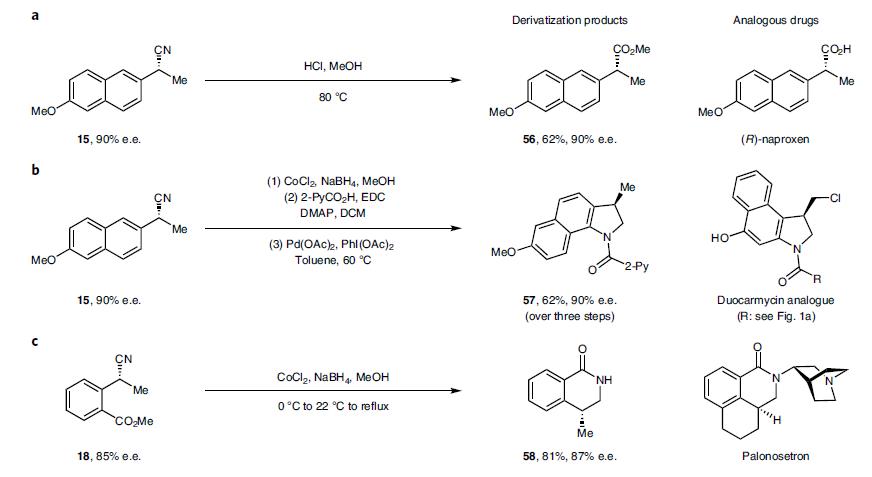 极化的π键,如C=O、C=N键的氢氰化反应再早期就已经有了详尽的研究,但C=C双键的氢氰化反应案例很少,在早期合成naproxen的案例中,曾用过渡态金属Ni催化。但是到目前为止,能达到既有底物范围广阔,又可以实现高度立体选择性的反应还是凤毛麟角。