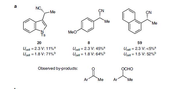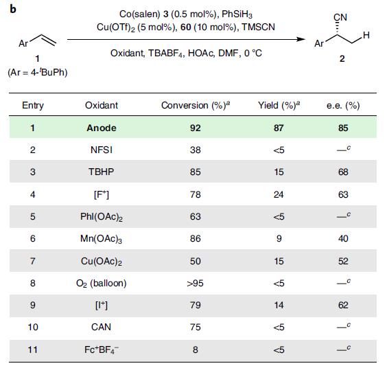 所需的氢氰化反应是整体氧化转化,这需要通过一对单电子氧化事件使两种催化剂进行转换,以使生成的CoII和CuI物种返回到其反应性CoIII和CuII氧化态(图2a)。因此,成功实现该反应的关键在于找到可以容纳两个反应的氧化条件。一方面,钴催化的氢官能团化反应可以解决苯乙烯类底物化学选择性的问题,在氧化剂存在下,生成的苄基自由基氧化为苄基阳离子。另一方面,铜催化的氰基化反应,需要强效的氧化剂,这可能限制反应底物的范围,特别是对氧化剂敏感的官能团。而电化学可以精准调节最小电压,满足氧化剂的催化循环。