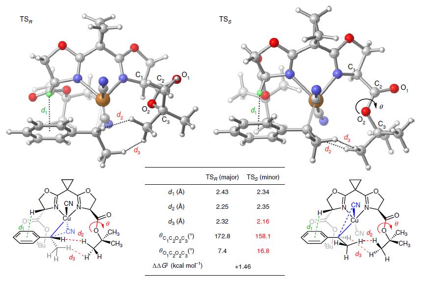 在这个反应中,铜催化剂在sBOX配体的作用下,还原消除生成C-CN键,是立体选择性的关键。在过渡态中,配体上的酯衍生物可能提供了吸引力,如酯上α酸性氢的与底物上的芳香环产生C-H-π键作用,而配体上体积较大的叔丁基产生较大的立体排除力,这种吸引、排斥相互作用决定了立体选择性。密度泛函理论(DFT)计算也证实了这点,如图5所示,TSR中距离更大些。