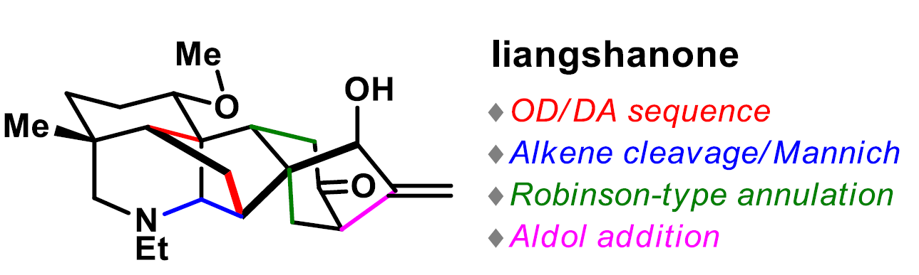 四川大学华西药学院秦勇和刘小宇课题组首次报道了六环贝壳杉烷类生物碱Liangshanone的全合成。该反应涉及氧化去芳化/Diels-Alder(OD/DA)环加成、串联烯烃裂解/Mannich环化反应、Robinson环化以及分子内的aldol加成等关键反应步骤。此外,进一步证明了OD/DA策略在二萜生物碱的全合成中的实用性。