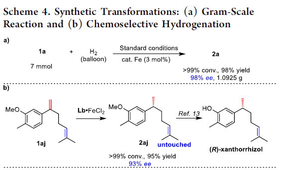 接下来,该小组进一步考察上述不对称氢化策略的合成应用价值。首先,作者发现,在3 mol % 铁配合物存在下进行的克级规模实验中,能够获得98%收率以及98%ee的产物2a(Scheme 4a)。同时,作者观察到,在具有更高立体位阻的Lb·FeCl2催化剂存在的条件下,带有两种不同类型的碳-碳双键的底物1aj,同样能够获得95%反应收率与93%ee的产物2aj。并且,底物中的三取代烯键未参与相应的氢化过程 (Scheme 4b)。这一独特的底物识别性能在序列合成策略的设计中具有潜在的应用价值。