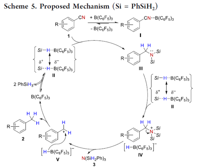 接下来,作者通过一系列相关的时间分辨1H-NMR谱学 (seeSI)研究表明,B(C6F5)3与苄腈在混合之后,能够迅速并可逆地形成相应的Lewis加合物。同时,该小组通过相关的控制实验研究表明,反应过程中涉及由腈到胺的双重硅氢化路径,之后通过苄基C-N键的还原断裂过程,形成最终的还原去氮化产物,并伴随含氮副产物trisilazane的形成 (Scheme 4)。
