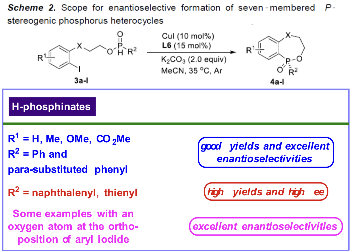 总结:临沂大学的杨文强课题组报道一种全新的采用铜催化剂促进的对映选择性分子内C-P交叉偶联/环化反应方法学,进而成功完成一系列六、七、八元环P-立体生成中心含磷杂环分子的构建。这一全新的对映选择性合成转化策略具有温和的反应条件、良好的反应收率以及优良的对映选择性等优势。