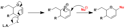 通过路易斯酸活化离去基团后产生离域的氧杂烯丙基碳正离子作为反应活性种进行反应。