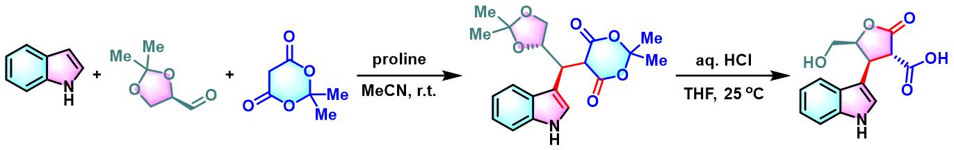 1978年,日本Hokkaido大学药学部(Faculty of Pharmaceutical Sciences, Hokkaido University, 北海道大学薬学部)的Yonemitsu(米光 宰, Yonemitsu Osamu)研究室首次报道了使用有机催化剂脯氨酸实现Meldrum酸、乙醛与吲哚之间的三组分一锅缩合反应,成功完成3-取代吲哚衍生物的合成[1]。